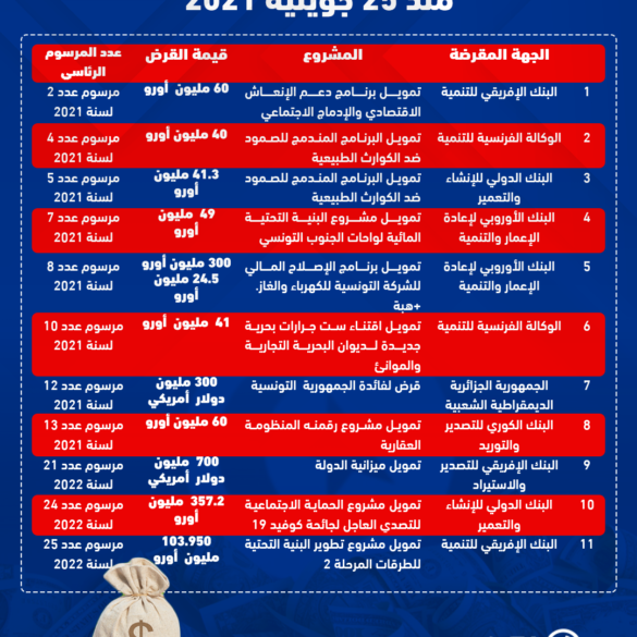 اكثر من 6500 مليون دينار قيمة القروض الخارجية التي تمت المصادقة عليها بأوامر رئاسية منذ 25 جويلية الماضي.