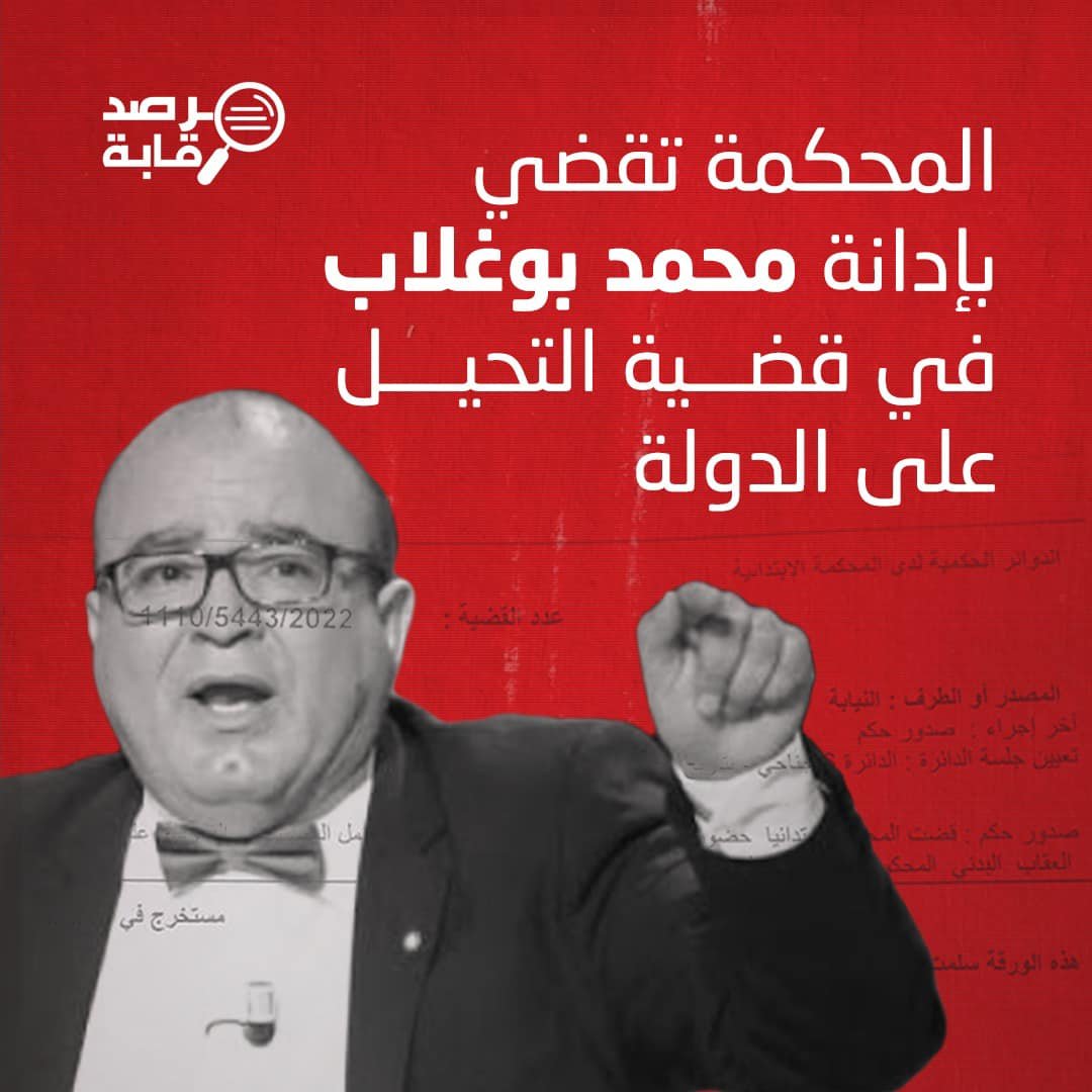 أصدرت المحكمة الابتدائية بتونس 1 حكما بسجن المتهم محمد بوغلاب مدة شهرين اثنين وحمل المصاريف القانونية عليه واسعافه بتأجيل تنفيذ العقاب البدني المحكوم به في الشكاية المرفوعة ضده من طرف مرصد رقابة في ماي 2021 والمتعلقة بأعمال التحيل التي ارتكبها الشخص المذكور تجاه مؤسسته الاذاعة الوطنية وحصوله على منافع من المال العام دون وجه حق.