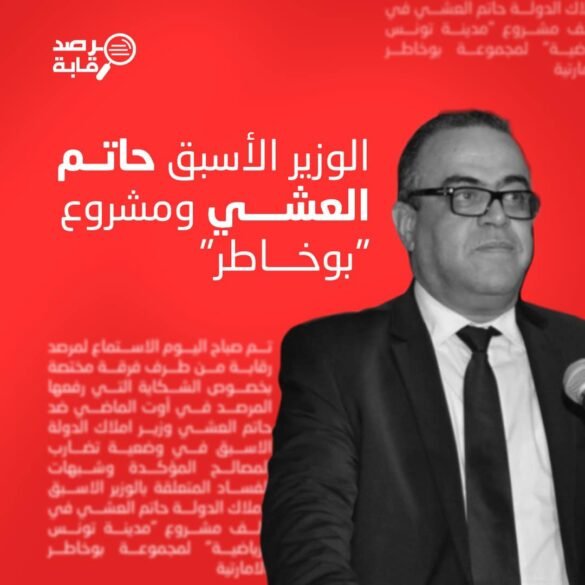 تم يوم الجمعة الماضي الاستماع لمرصد رقابة من طرف فرقة مختصة بخصوص الشكاية التي رفعها المرصد في أوت الماضي ضد حاتم العشي وزير املاك الدولة الاسبق في وضعية تضارب المصالح المؤكدة وشبهات الفساد المتعلقة بالوزير الاسبق لأملاك الدولة حاتم العشي في ملف مشروع “مدينة تونس الرياضية” لمجموعة بوخاطر الامارتية.