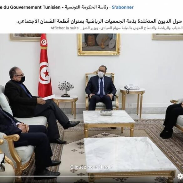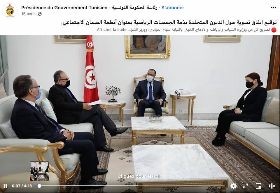 تلقى مرصد رقابة نسخة من اتفاق تسوية الديون المتخلدة بذمة الجمعيات الرياضية بعنوان أنظمة الضمان الاجتماعي الذي تم توقيعه يوم الخميس 15 أفريل 2021 بين وزراء الشؤون الاجتماعية والمالية والرياضة والرئيس المدير العام للصندوق الوطني للضمان الاجتماعي تحت اشراف رئيس الحكومة.