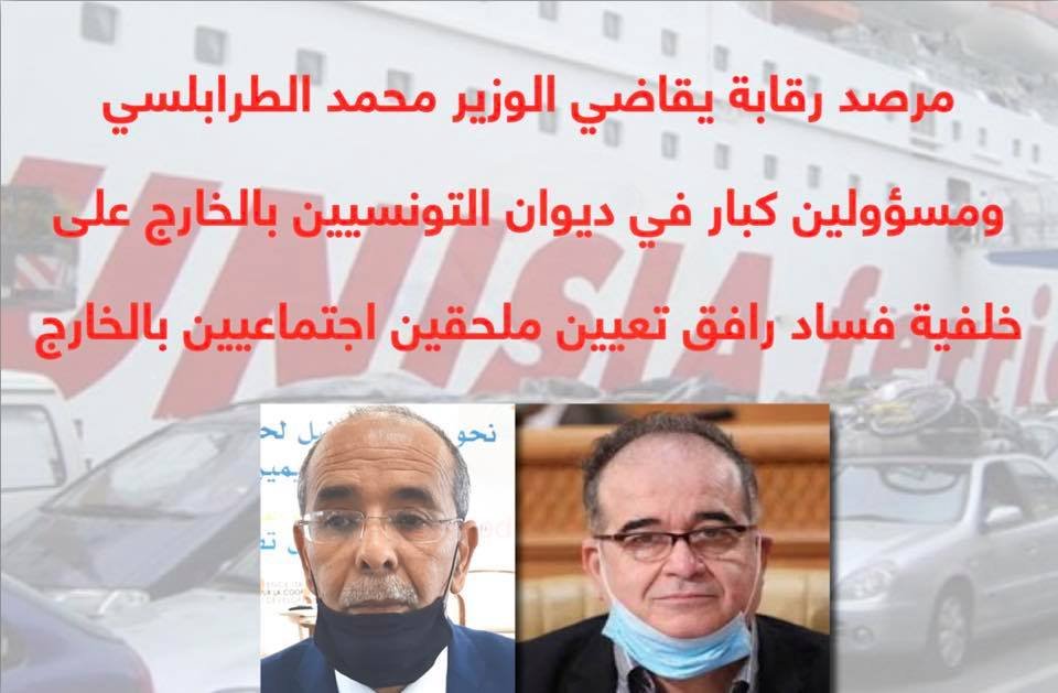 قام مرصد رقابة صباح اليوم الاربعاء 30 جوان 2021 بايداع شكاية جزائية لدى السيد وكيل الجمهورية بخصوص جملة الاخلالات وشبهات الفساد الجدّية التي شابت عملية تعيين دفعة الملحقين الاجتماعيين بالخارج لسنتي 2018 و2019 بتواطئ بين مسؤولي ديوان التونسيين بالخارج ووزير الشؤون الاجتماعية محمد الطرابلسي.