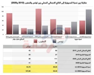 في حين تطورت الديون التونسية من 23 مليار دولار في 2010 الى 41 مليار دولار في 2020 (بنسبة 80٪)، مع انخفاض الناتج المحلي الاجمالي من قرابة 42 مليار دولار في 2010 الى 38,5 مليار دولار في 2019 و38 مليار دولار في 2020.