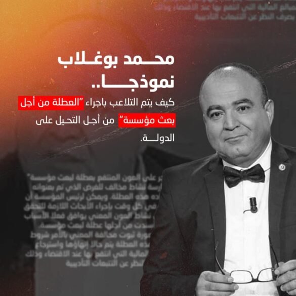 الصحفي في الاذاعة الوطنية محمد بوغلاب حصل على العطلة في فترة يوسف الشاهد، بعد أن كان تقدم بمطلب إحالة على عدم المباشرة وسحبه بعد ذلك. وحصل في 23 ديسمبر 2019 على العطلة لمدة سنة لبعث “مؤسسة للانتاج السمعي والبصري والاستشارة واعداد الومضات الاشهارية، مع التعهد بتشغيل ما بين 10 و15 من حاملي الشهادات العليا في اختصاص السمعي البصري”. ولم يحصل أي شيء من ذلك، وتوجه بوغلاب في المقابل للعمل ك “كرونيكور” في قناة اذاعية وقناة تلفزية منافستين لمؤسسة الاذاعة الوطنية في خرق واضح للقانون.