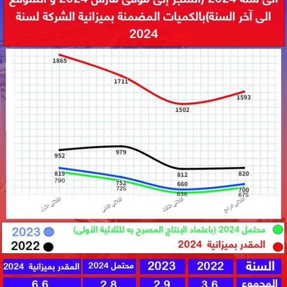 و باعتماد نَسق الإنتاج للثّلاثة أشهر الأولى لسنة 2023، من المُتوقع أن يبلغ الإنتاج الجملي لسنة 2023 في حدود2.8 مليون طن أي بنقص 3.8 مليون طن مُقارنة بتقديرات الإنتاج، وهو ما يعني خسارةَ موارد بقيمة 1341 مليون دينار (باعتماد مُعدل سِعر البيع وسعر الصرف المُضمّنان بميزانية الشركة لسنة 2024).